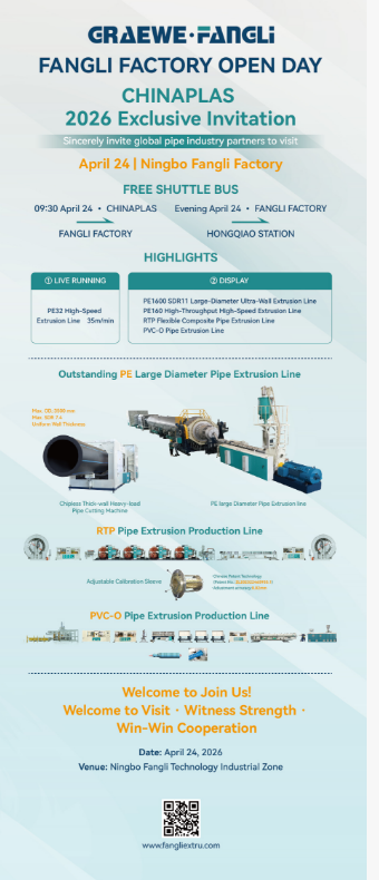 21 से 24 अप्रैल तक चाइनाप्लास 2026 में, बूथ 7.1सी14 पर फैंगली टेक्नोलॉजी पर जाएँ। आइए एक साथ प्लास्टिक पाइप उपकरण में नवाचार और भविष्य के सहयोग का पता लगाएं!